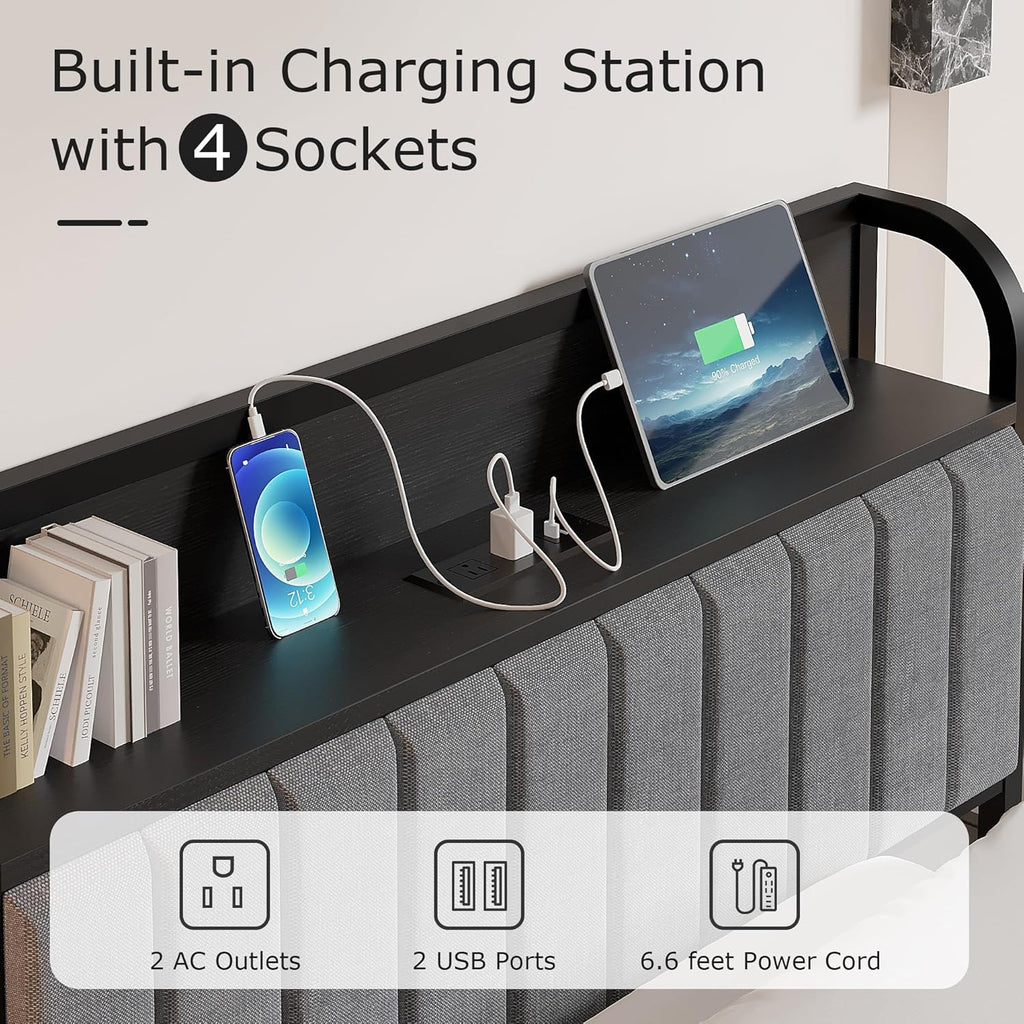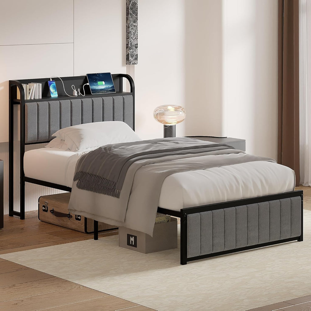 VECELO Twin Bed Frame, Storage Upholstered Headboard with Charging Station